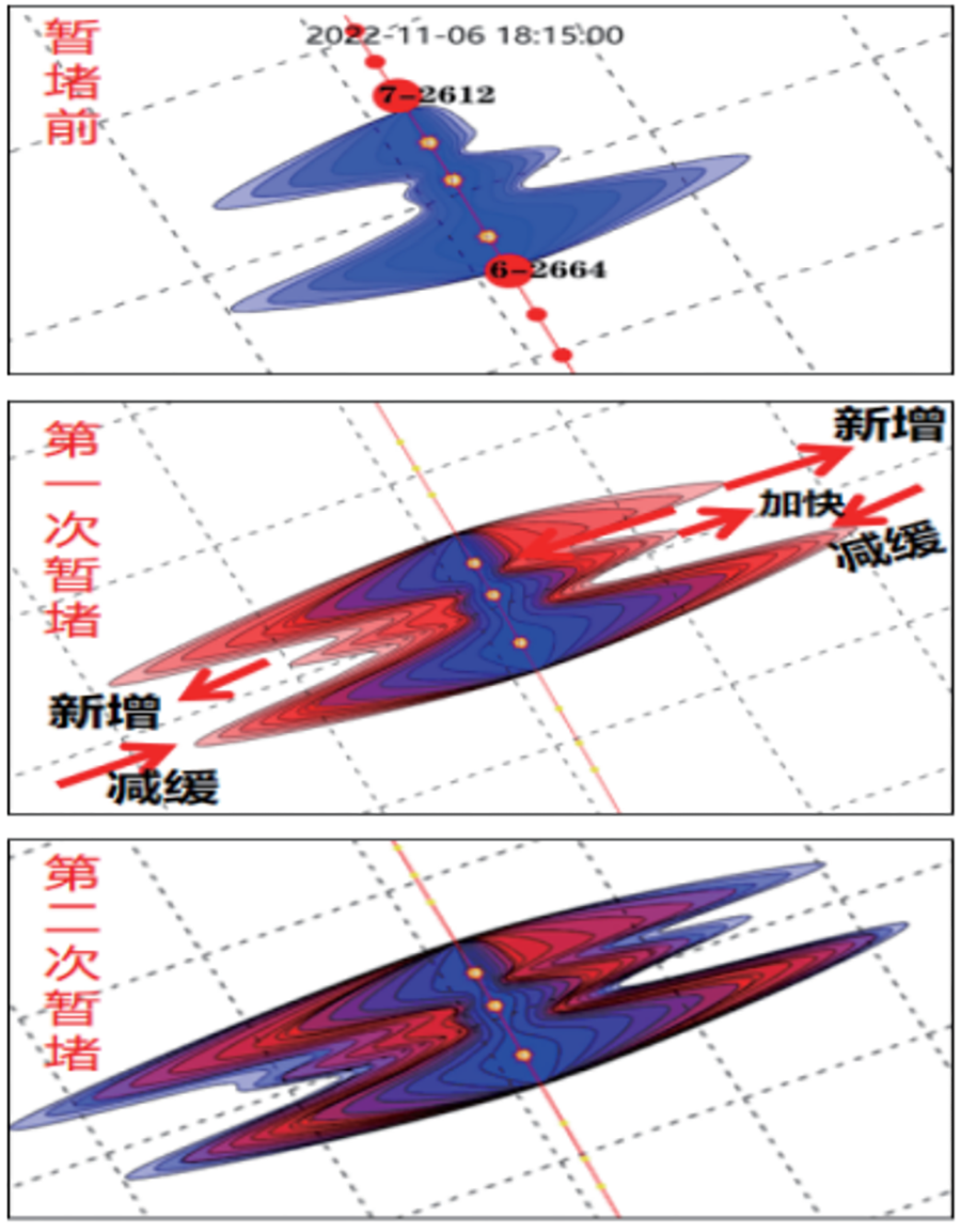 甲方?jīng)Q定進(jìn)行暫堵,第一次暫堵后,第2、3簇產(chǎn)生新的裂縫并快速突進(jìn),此前突進(jìn)點(diǎn)第1簇進(jìn)液有所減緩,監(jiān)測(cè)結(jié)果顯示本次暫堵效果良好;對(duì)照壓力曲線,發(fā)現(xiàn)暫堵劑到位以后,壓力上漲約10MPa, 還有少許破壓跡象,與監(jiān)測(cè)結(jié)果相吻合;