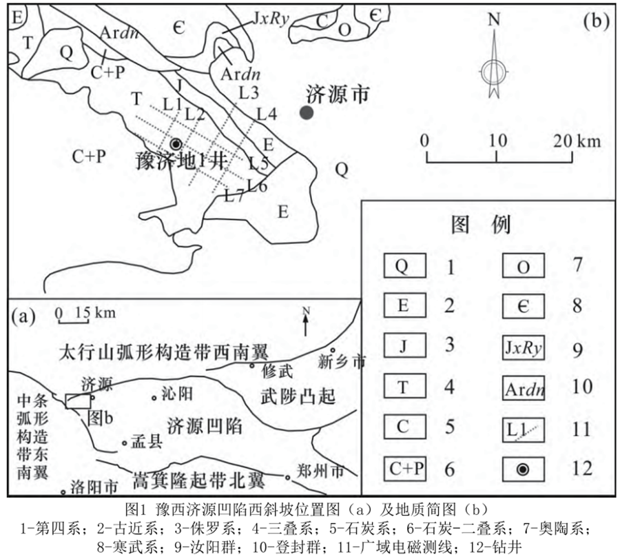 濟(jì)源凹陷位于南華北盆地西北緣,北鄰太行山,南鄰蒿萁隆起,西連黛眉寨隆起,東以武陟凸起與中牟凹陷相隔,面積2800km2 。該盆地是在華北大型內(nèi)陸盆地基礎(chǔ)上繼承和演化而來的疊合沉積盆地,結(jié)晶基底由太古代到早元古代結(jié)晶巖系和中上元古代和古生代的沉積巖系組成,與華北板塊相同。凹陷內(nèi)地層發(fā)育較齊全,自下而上主要發(fā)育寒武系、奧陶系馬家溝組、石炭系本溪組和太原組、二疊系山西組、下石盒子組、上石盒子組和石千峰組,以及下三疊統(tǒng)劉家溝組、和尚溝組和中三疊統(tǒng)二馬營組和油坊莊組。晚三疊世-中侏羅世,濟(jì)源盆地基底緩慢抬升,盆地不斷萎縮,在此構(gòu)造背景下,自下而上依次沉積上三疊統(tǒng)椿樹腰組、譚莊組、下侏羅統(tǒng)鞍腰組、中侏羅統(tǒng)楊樹莊組和馬凹組。