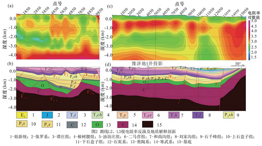 L2剖面:電性特征表現(xiàn)為“中低-中高-低-高”的層狀電性特征(圖2a)。淺部中低阻層電阻連續(xù)性較差,呈“串 珠狀”;中部中高阻在南段(點號850~4550)較薄,在中段(點號4550~7850之間)厚度陡然增大;深部低阻呈“南高北低”的特征,在點號8150~8950之間底部高阻向上翹起,導(dǎo)致該段低阻呈倒 “V” 字形,低阻最大深度約2200m。根據(jù)電性特征推斷出8條斷層(圖2b), 其中 F2-2 為隱伏斷層,位于三疊系之下,切穿二疊系、石炭系、奧陶系和寒武系;F2-6 斷層位于3550點附近,斷層北傾,導(dǎo)致二疊系陡然增厚;F1-2、F3分別在點號4750和6250附近,切穿三疊系;F2-4 斷層北傾,被南傾的F2-5 斷層錯斷,垂直位移約800m, 導(dǎo)致寒武系向上抬升,呈倒“V”字形。