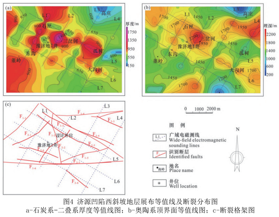 豫西地區(qū)濟(jì)源凹陷發(fā)育上古生界山西-太原組的暗色泥巖和煤系烴源巖,三疊系底部的石英砂巖和長石砂巖、二疊系大套長石砂巖及三角洲砂巖可作為儲層,同時推測發(fā)育自生自儲、上生下儲、下生上儲三套有利生儲蓋組合, 石炭-二疊系具有一定泥頁巖氣勘探開發(fā)潛力。有資料顯示南華北盆地發(fā)現(xiàn)下古生界寒武系海相烴源巖,并具有一定的生烴潛力,是值得進(jìn)一步勘探的有利目標(biāo)。然而,南華北盆地濟(jì)源凹陷構(gòu)造復(fù)雜,特別是濟(jì)源凹陷西斜坡的油氣勘探程度低。為確定濟(jì)源凹陷西斜坡石炭-二疊系及下古生界地層存在與否,以此次廣域電磁法反演電阻率解釋剖面圖、石炭-二疊系厚度等值線圖和奧陶系頂面等值線圖為依據(jù),結(jié)合地表露頭及地質(zhì)條件綜合研究,部署了豫濟(jì)地1井(圖4)。由圖4可看出,該井位附近斷裂構(gòu)造不發(fā)育,對油氣的保存相對較好。同時,預(yù)計該井鉆遇石炭-二疊系地層位置在750m左右,并且在1700m左右進(jìn)入下古生界。