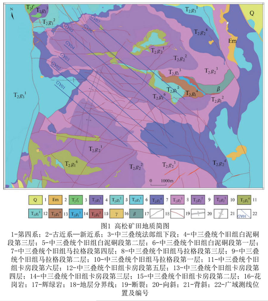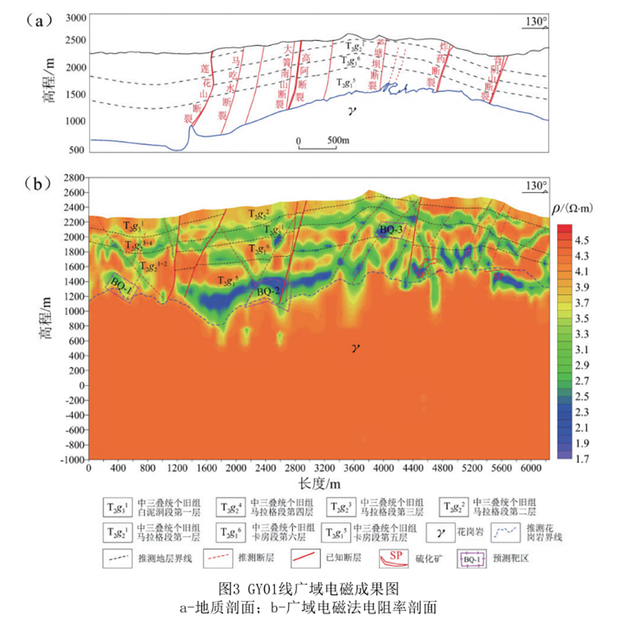 以GY01線(xiàn)廣域電阻率剖面(圖2)為例,剖面自上而下主要包括高阻-中低阻-高阻-低阻-高阻-低阻-高阻7個(gè)電性層,不同電性層產(chǎn)狀較平緩,與礦區(qū)地層總體傾角小的特征吻合。在低阻體呈高角度串珠狀或帶狀,以及高阻體被切錯(cuò)位移等部位則斷裂構(gòu)造發(fā)育。結(jié)合工作區(qū)地質(zhì)信息和巖石電性特征推測(cè):淺部層狀不連續(xù)高阻帶為碳酸鹽巖地層;中淺部低阻-中低阻則是巖石破碎、富水?dāng)嗔褞?、金屬硫化物礦(化)體和接觸蝕變等的體現(xiàn);中深部發(fā)育橫向低阻帶,推測(cè)為層間破碎/剝離帶,是地層界面巖石組構(gòu)發(fā)生變化、破碎、位移的反映;深部完整的高阻體為隱伏花崗巖基,花崗巖頂界因巖石破碎含水以及礦化蝕變等往往具低阻電性特征, 顯示深部存在大面積隱伏花崗巖體。