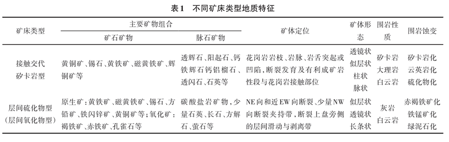 高松礦田的4種礦床類(lèi)型主要為:接觸交代矽卡巖型錫多金屬礦床、層間硫化物型錫多金屬礦床、含錫(銅)花崗巖型礦床以及熱液脈狀礦床。本文重點(diǎn)分析接觸交代矽卡巖型和層間硫化物型礦床的主要地質(zhì)特征(表1),通過(guò)系統(tǒng)的廣域電磁法探測(cè)得到深部地電信息,根據(jù)不同地質(zhì)信息反映的電性特征,建立地球物理電性異常找礦模型,以此為深部多金屬礦體的預(yù)測(cè)提供有效的物探信息。