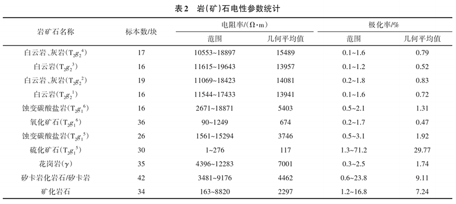 通過(guò)對(duì)高松礦田主要巖(礦)石進(jìn)行物性測(cè)試和統(tǒng)計(jì)分析發(fā)現(xiàn)(表2):中三疊統(tǒng)個(gè)舊組碳酸鹽巖地層電阻率最高,主要分布在13000~15000Ω ·m, 花崗巖電阻率比碳酸鹽巖地層稍低,主要為5000~10000Ω ·m,這兩類(lèi)巖性均表現(xiàn)為高阻低極化特征;硫化礦石和氧化礦石的電阻率最低,分布范圍為100~600Ω ·m, 表現(xiàn)為低阻高極化特征;不同蝕變類(lèi)型(礦化)巖石的電阻率則介于高阻和低阻之間,集中在3000~5000Ω ·m。由此可見(jiàn),工作區(qū)內(nèi)不同類(lèi)型巖(礦)石具有明顯的電性差異,通過(guò)在該區(qū)開(kāi)展廣域電磁法深部探測(cè),能有效反映深部不同地質(zhì)體的分布特征。