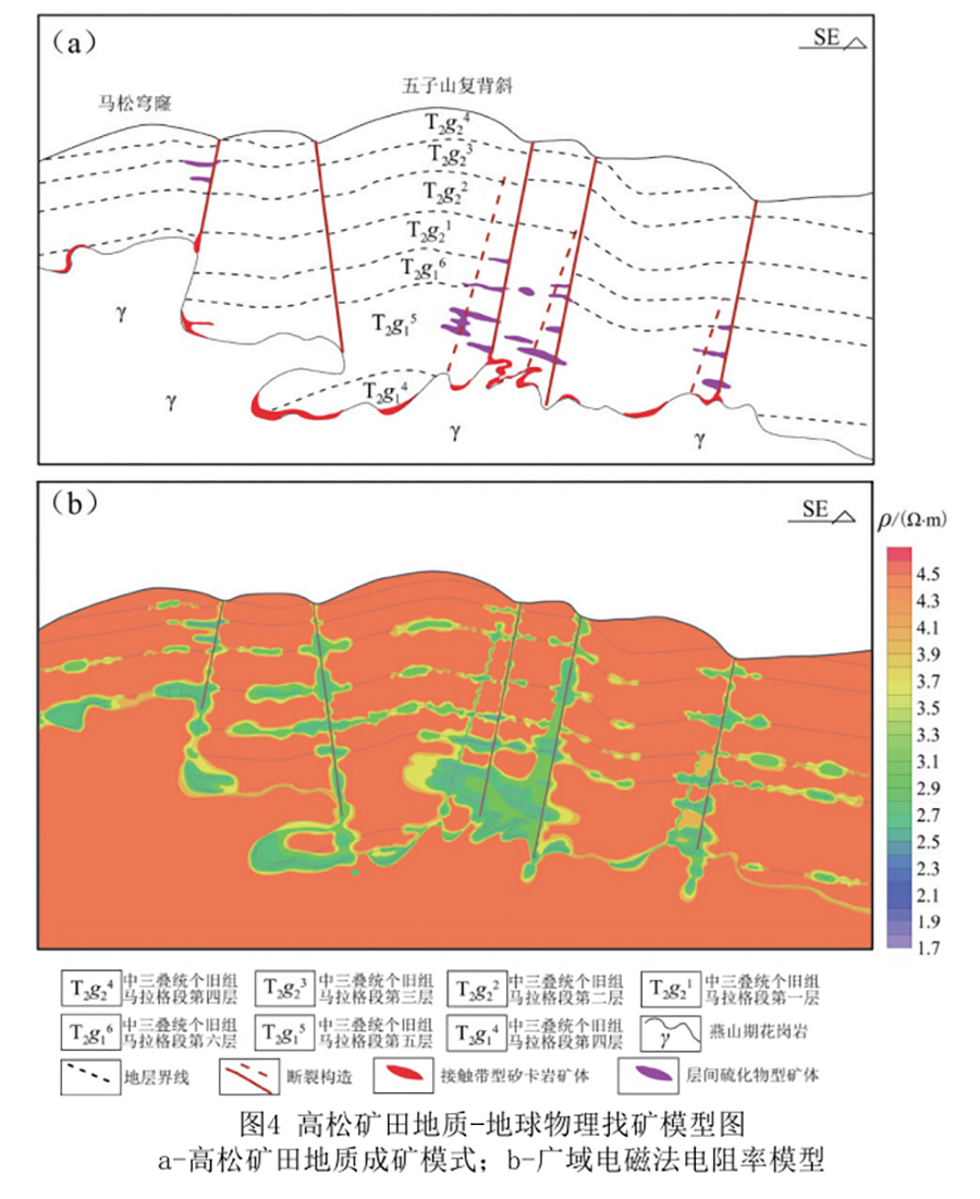 個(gè)舊超大型錫多金屬礦床開(kāi)采歷史悠久,成礦作用和礦化類(lèi)型復(fù)雜多樣。隨著淺部資源的消耗,如何尋找深部接觸交代矽卡巖型錫多金屬礦和層間硫化物型錫多金屬礦,成為個(gè)舊高松礦田亟待解決的重要課題。為推動(dòng)高松礦田中深部找礦突破,將廣域電磁法應(yīng)用到高松礦田進(jìn)行深部探測(cè),查明了深部地質(zhì)體的分布形態(tài);綜合分析 了礦田成礦地質(zhì)特征,總結(jié)了矽卡巖型礦體和層間硫化物型礦體的礦床地質(zhì)特征;同時(shí)結(jié)合廣域視電阻率特征,建立了高松礦田兩種主要礦床類(lèi)型的地質(zhì)-地球物理模型,以此模型進(jìn)行成礦有利區(qū)預(yù)測(cè),可為個(gè)舊地區(qū)及國(guó)內(nèi) 其他類(lèi)似多金屬礦的地球物理勘探提供參考和借鑒。